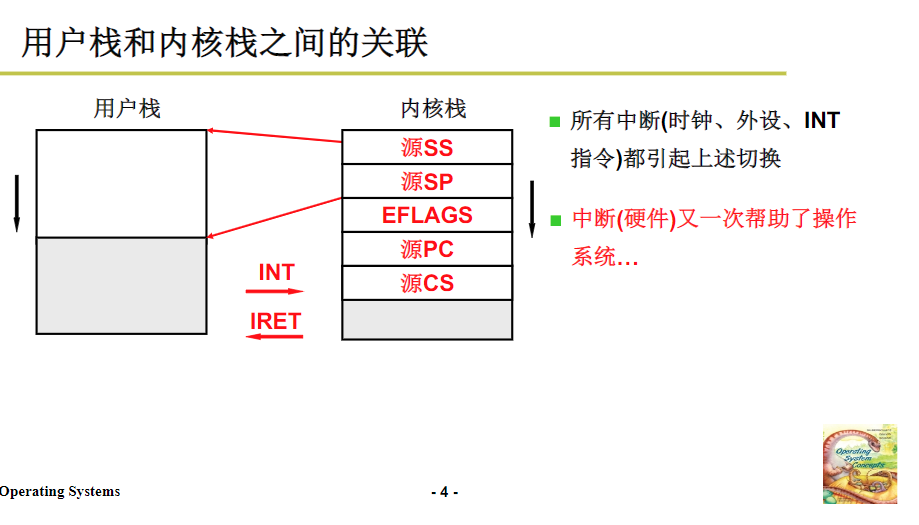 内核级线程维护着两套栈,一套用户栈,一套内核栈。int指令触发的时候,发生中断,硬件里有写入内核栈的指令,此时触发内核栈,进行切换。并且内核栈也会连上用户栈,形成一套栈。