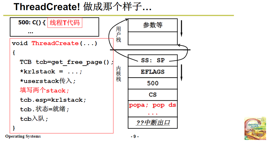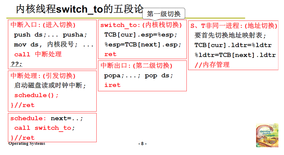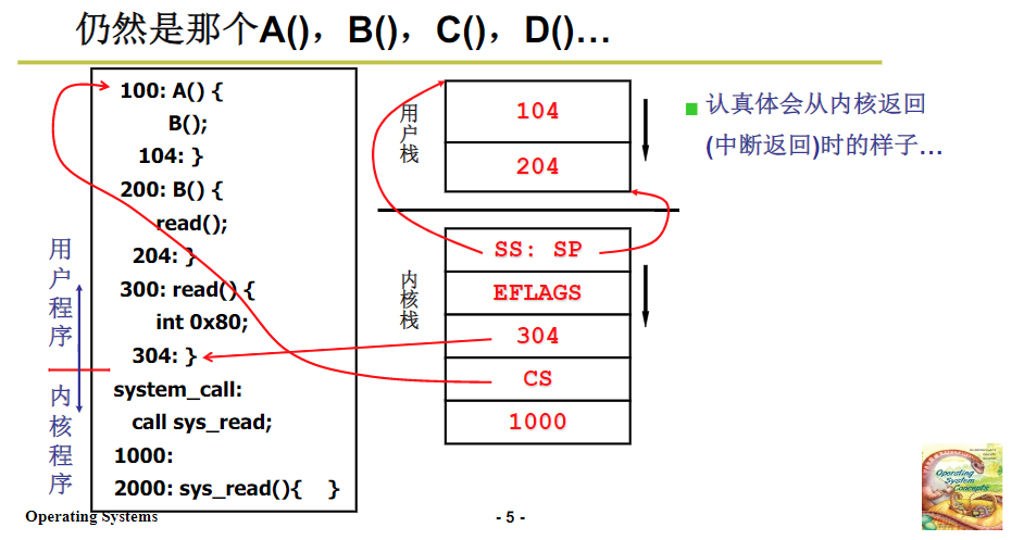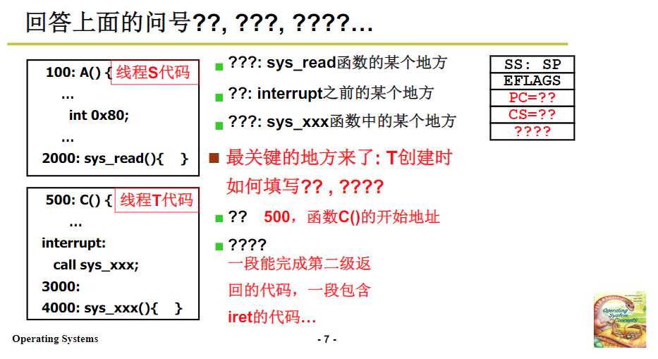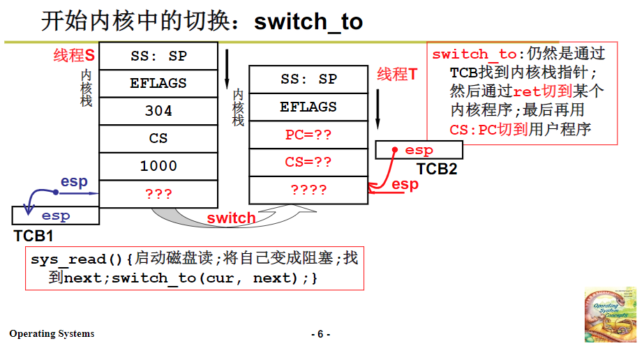 A调用B,B进行read,然后读取到中断,中断的时候,read内核调用,使用到硬件写入的内容,用户栈和内核站进行了关联,然后再内核中执行,执行的时候会磁盘读写,这时候就会阻塞了,会调度让其他的线程工作。找到TCB,去完成内核栈的切换,内核的切换之后,在使用iret,去直接切换到用户栈中。